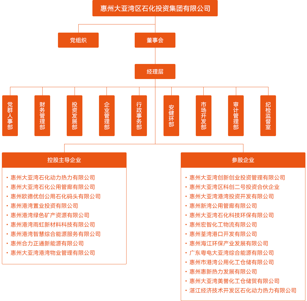 惠州大亞灣區石化投資集團有限公司(簡稱石化投資集團)成立于2008年5月,是大亞灣區屬國有獨資企業,截至目前公司注冊資本31.06億元,旗下全資、控股、參股企業共 22 家。公司自成立以來,始終秉持“為世界級綠色石化高地提供一流的公用配套服務”使命,主要布局綜合能源、物流輸送、生產服務、重點工程、石化及新材料五大業務版塊,聚焦完善集中供熱、管廊、碼頭、倉儲等建設運營,打造“即插即用”的綜合配套體系,助推大亞灣石化區加速建成“六個一流”的世界級綠色石化產業高地。